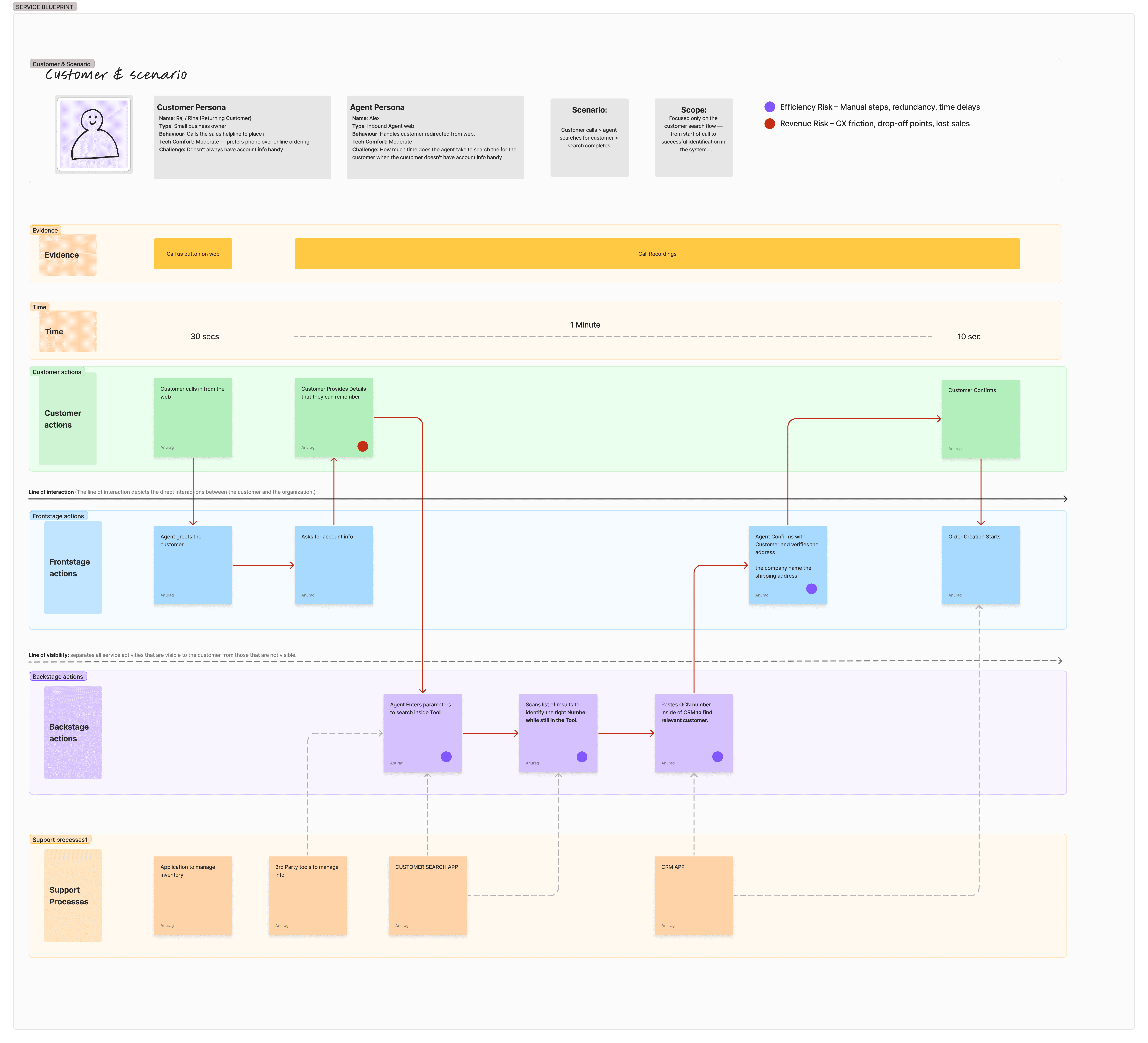 I began with a 45-minute service blueprinting session to understand the full ecosystem agents operated within during live calls.
