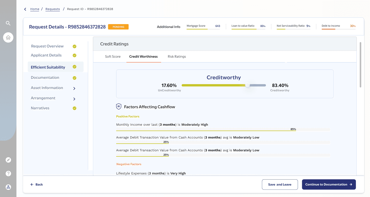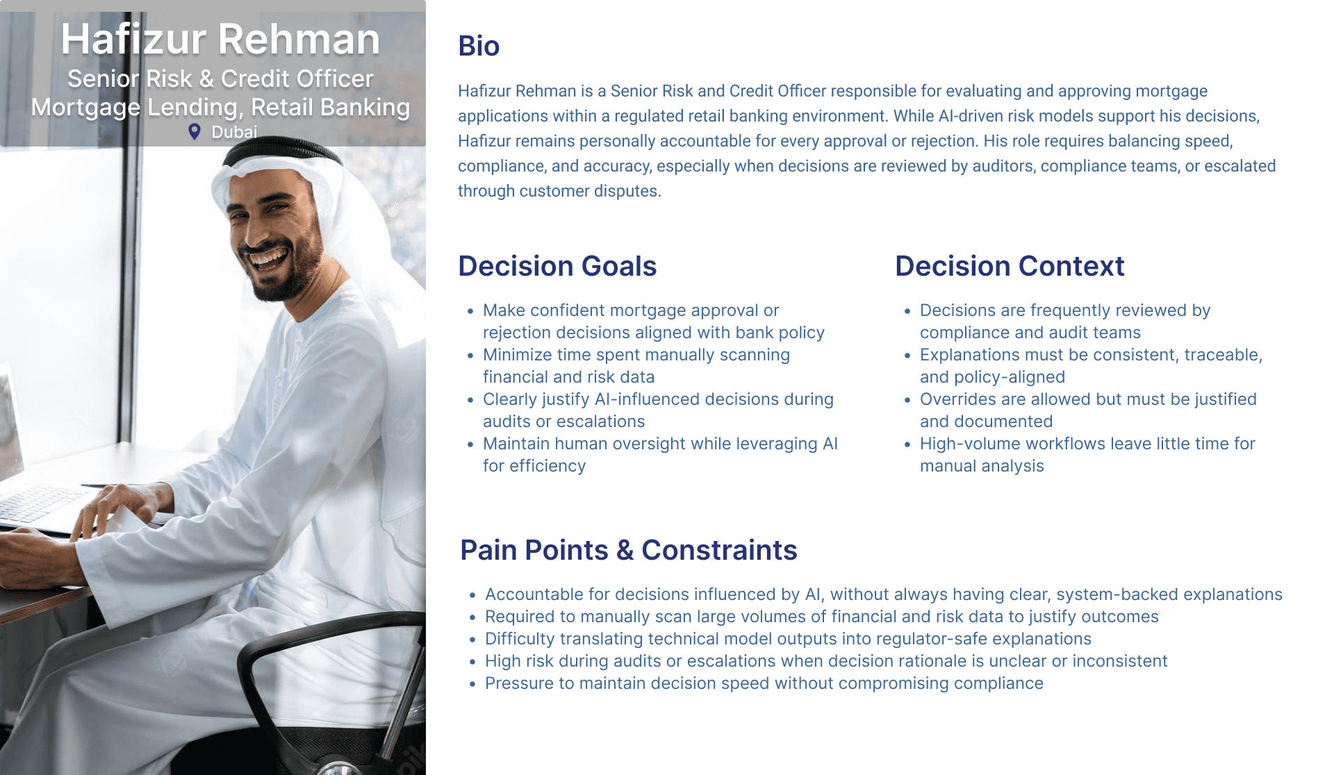 risk and credit officers had to manually scan large volumes of data and interpret technical AI outputs to justify mortgage decisions, resulting in slower evaluations and inconsistent explanations.Mapped lender-side decision workflows to understand how risk officers reviewed applications, where they paused to assess risk, and when explanations were required for compliance, audits, or escalations, revealing points where the interface overloaded users with raw data instead of supporting accountability.