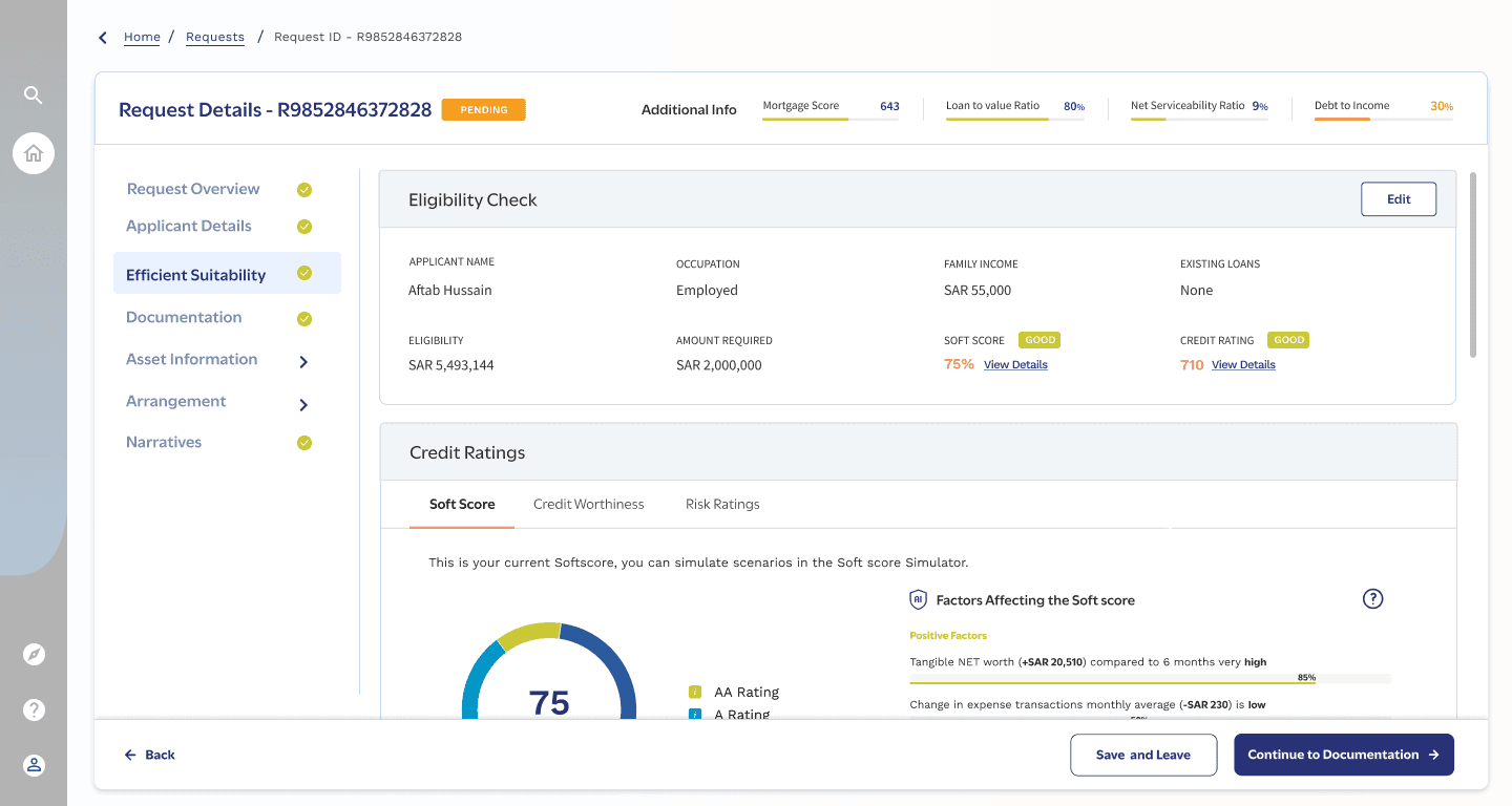 risk and credit officers had to manually scan large volumes of data and interpret technical AI outputs to justify mortgage decisions, resulting in slower evaluations and inconsistent explanations.Introduced progressive disclosure to align information density with the natural analysis flow, surfacing decision-critical signals such as soft scores and XAI-driven explanations first, while keeping detailed financial data and model inputs accessible for deeper, policy-aligned review.